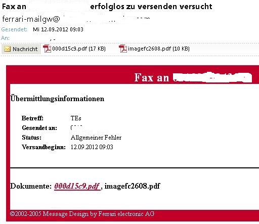Der Faxvorgang als solches hat immer prima funktioniert. Seit gestern Nachmittag kommt (und ohne das ich irgendetwas umgestellt hätte) folgende Fehelrmeldung in den Übermittlungsinformationen: