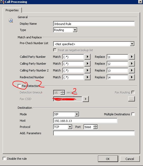 Kann ich auf den "Inbound" Rule das so ablegen, dass er das Fax statt auf SIP Lync 192.168.0.13 auf 066 555 44 33 leitet?