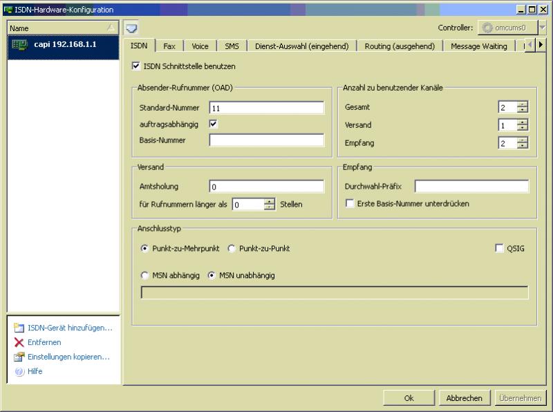 Im OfficeMaster unter ISDN wurde folgendes konfiguriert: