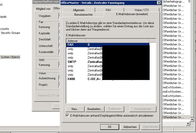 (6096) 13/07/30 07:43:58 - INFO: ADsGetUserDN: Searching... (6096) 13/07/30 07:43:58 - INFO: ADsGetUserDN: A user for [FAX:19] was found. (6096) 13/07/30 07:43:58 - INFO: ADsGetUserDN: LDAP://CN=Zentraler Faxeingang,CN=Microsoft Exchange System Objects,DC=meine-firma,DC=org (6096) 13/07/30 07:43:58 - INFO: ADsGetProxyAddress: DN --> 'LDAP://CN=Zentraler Faxeingang,CN=Microsoft Exchange System Objects,DC=meine-firma,DC=org' (6096) 13/07/30 07:43:58 - INFO: ADsGetProxyAddress: Got Address 'Zentralfax@meine-firma.de'. (6096) 13/07/30 07:43:58 - WARNING: ADsGetURIAttribute: The user rights attribute cannot be retrieved, so a global value will