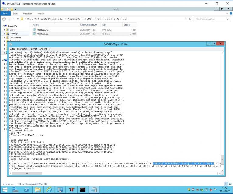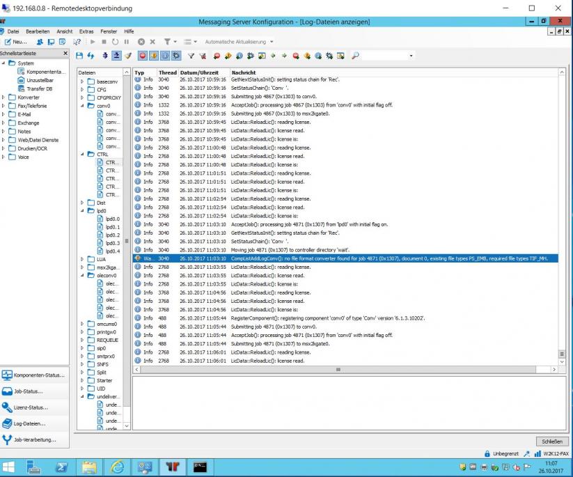 Also die testfax.txt mit Notepad geöffnet und auf den HP Laserjet 5 gedruckt. Job bricht ab, weil keine Ziealdresse konfiguriert ist. Also conv0 gestoppt und das Verzeichnis C:\ProgramData\FFUMS\fmsrv\work\CTRL\wait geprüft.